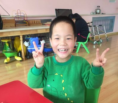 From orphanage staff: He is currently receiving basic education at the orphanage, such learning to talk, playing games, listening to stories, and so on. His knees and elbows can bend and move; his shoulders and hip joints are movable. He can speak complete sentences, such as:” Grandma is coming”, “Li, Zhi Peng opened the door”, and “someone is calling”, etc. He can sing “Two Tigers” with the music. He is walking very fast and he can go up and down the stairs when holding on the rails. He is outgoing, active, cheerful and sociable. His caregivers adore him very much. He likes to play with other children and loves to play with toys, such as building blocks and toy cars.