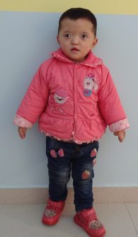 According to her adoption report, at the age of two months she began to smile but cried a lot. At the age of 4 months her body was poor and she couldn’t raise her head up, but could roll over. Sometimes she would laugh aloud. At the age of 8 months she could sit with support and began crawling. At the age of 10 months she could stand on her tiptoes while in a walker. At the age of 12 months she could lie down, distinguish acquaintances from strangers and understood her name. At the age of 15 months she could sit independently and was making early sounds. She could use her hands to hold things and was learning to feed herself. At the age of 18 months she observed adults actions and could reach her hands out to ask for a cuddle. She could imitate simple actions and expressed likes and dislikes to people and objects. She began to walk, but unsteadily, and started using sounds intentionally with meaning, such as Ayi (auntie.) After entering foster care her physical state strengthened and her weight increased. She could use her hands to hold a railing to go up and down stairs.