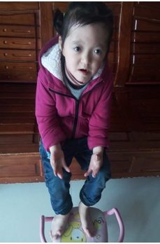 At the age of two years she could push a car to walk forward and used one hand to hold a railing to go up and down stairs. She could aim when throwing a ball and was learning to speak words and use useful expressions. At the age of 3 years old she could go up and down stairs without using a railing, could feed herself, and could jump with both feet. She liked her foster grandpa best and enjoyed watching TV and playing with other children her age. Her adoption report was written in February 2016 and she was said to have a strong adaptive capacity, a good appetite, normal bowel habits and be an active and lovely little girl. She liked outdoor activities and her favorite toys were dolls.