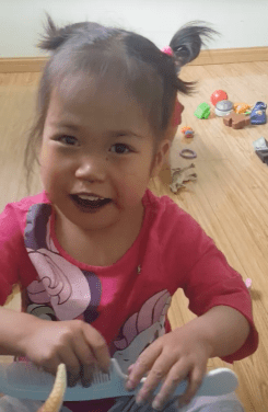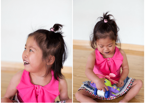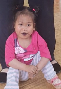 Sophie received surgery (Glenn operation) in December 2015 for congenital heart disease, (VSD & ASD), and umbilical hernia. At the time her report was written Sophie was 3.5 years old. She was able to look at her hands and hold them together, grab and hold objects, pinch objects with her fingers and pass objects between her hands. She could crawl, sit and walk with her hands held. She had begun to babble and could say simple words and would smile when she saw a familiar person. When she would cry a cuddle would help her calm down. She liked dolls and was said to be a quiet and bright girl. If she did something wrong she would stop after seeing the facial expression of a caretaker. When another child needed comforting she patted that child’s hand. Sophie enjoyed being pushed in a stroller and playing outside. She would smile when she was happy or saw something she liked. She liked to watch TV and read picture books. Sophie was said to be timid and afraid of strangers.