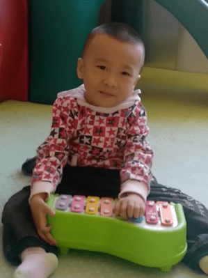 Jacob is a serious little guy until something catches his fancy, then he breaks into an impish grin. He has normal intelligence, is quiet, likes to listen to music, play with toys and cars that make sounds, and watch TV. He can communicate with people, express personal needs, understand and follow instructions, and knows body parts and articles commonly used in daily life. He asks “what is this” and speaks sentences of 3-5 words. He has bowel and bladder control.