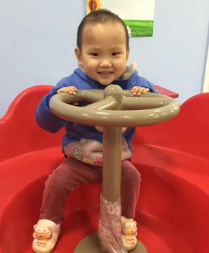 When Lexi first entered her institute she was thought to possibly be premature. She could raise her head or roll over and she was scheduled to receive rehabilitation training. At six months of age she still couldn’t raise her head, roll over or speak words. At 12 months she could freely roll over and sat with support. She could visually follow moving objects and people but still wasn’t speaking. At 18 months she could sit independently and could stand holding a handrail. She was able to hold her own bottle and began speaking sounds. At two years old she could walk holding on to her bedrail and was crawling. She was also making more sounds such as Da, Yi and Ya. At 2.5 years old her rehabilitation training was stopped. She could walk independently but had a poor gait. She liked to play with peers but wasn’t able to understand instructions from caregivers.